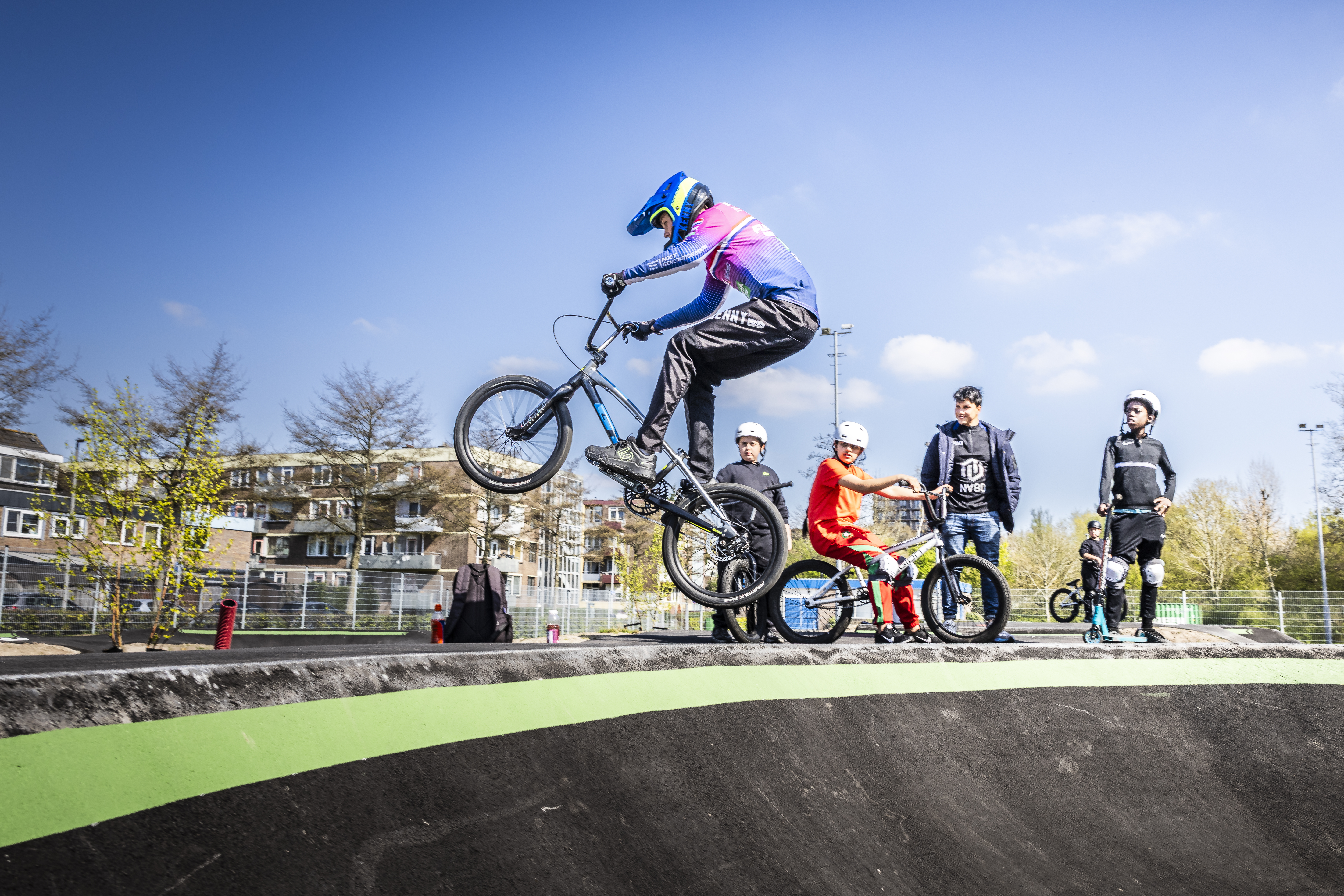 “Ik ben heel blij met hoe de samenwerking met Sportbedrijf Rotterdam verlopen is. Op het moment dat ik de hoop op een pumptrack begon te verliezen, hebben zij het laatste zetje gegeven om het toch mogelijk te maken. We hebben duidelijke afspraken gemaakt over het onderhoud en het beheer. Wij zijn nu hoofdgebruiker van het sportcomplex. Binnen onze openingstijden hebben wij het alleenrecht op het gebruik van de pumptrack, daarbuiten zorgen wij ervoor dat het vrij toegankelijk is. Dan zie ik peuters uit de wijk op loopfietsjes voorbijkomen, die gaan als een malle. Maar we hadden laatst ook een pro die zijn backflips oefende. Met de pumptrack is Pendrecht een attractie rijker.”