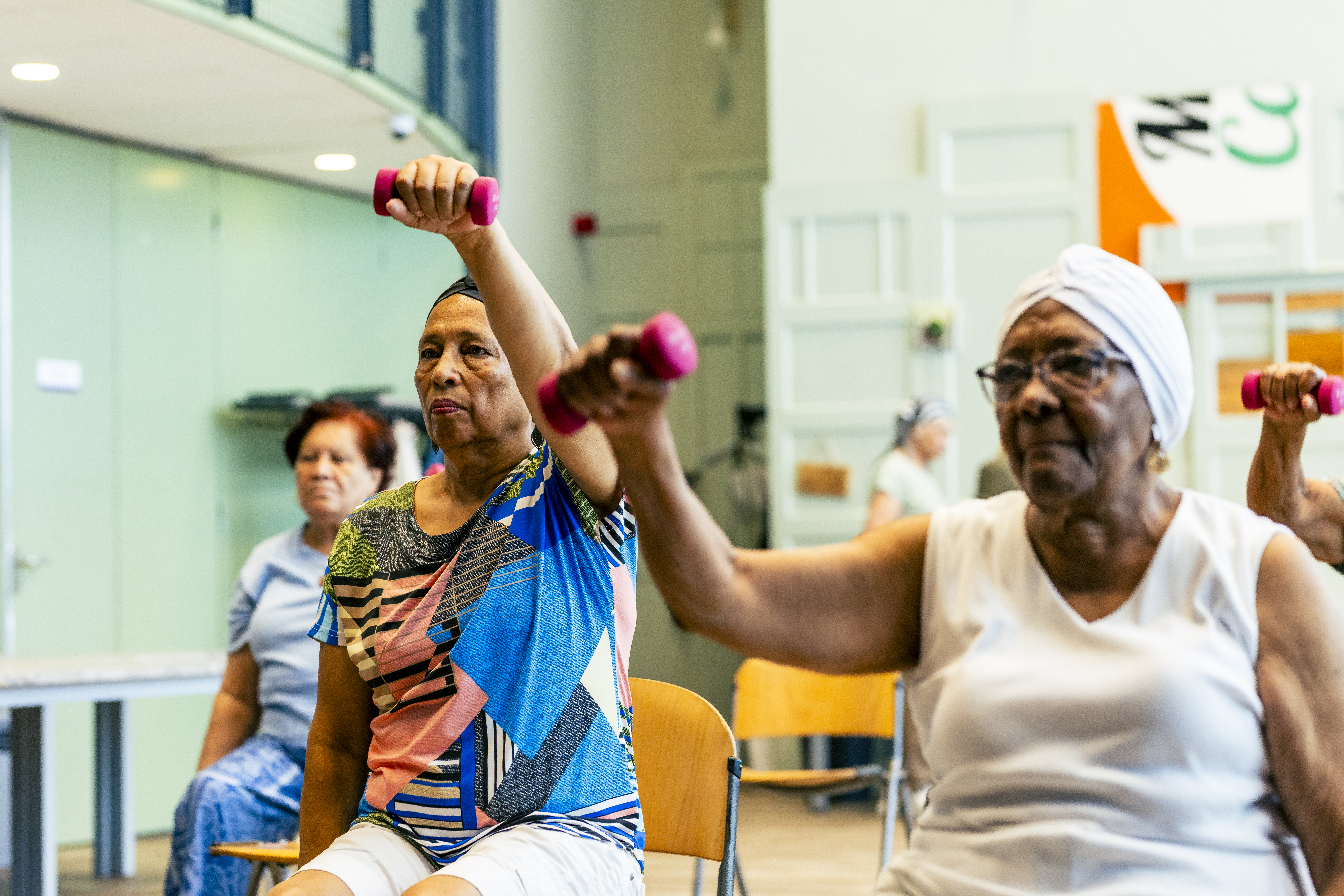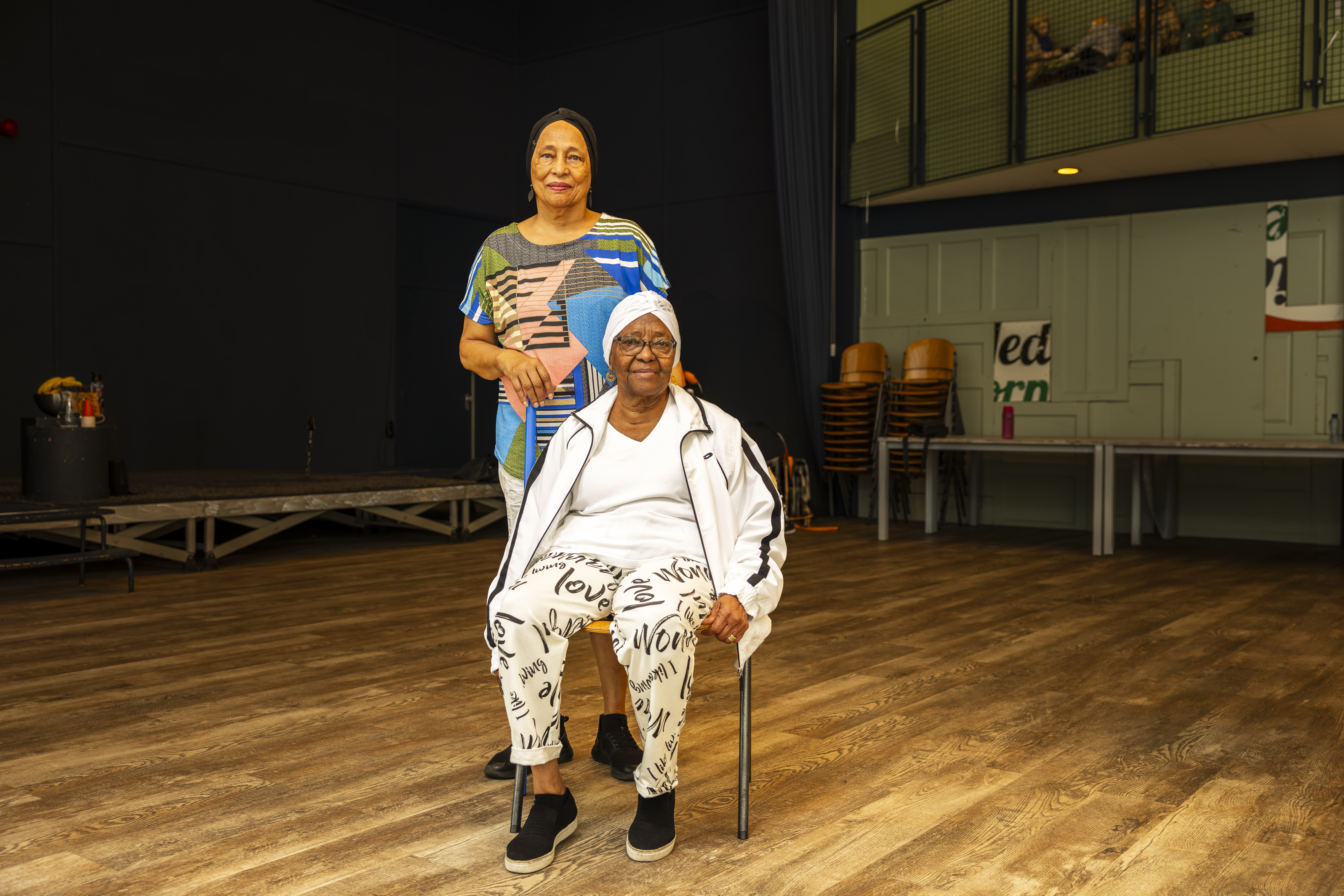 Teresa:‘ Het is de stoelfit-les, van Paula Delgado Fernandes. Eigenlijk doen we allerlei oefeningen en bewegingen vanuit en met de stoel. Er staat muziek op die ons laat swingen, en we zijn met een groep mensen die we bijna allemaal kennen vanuit de Kaapverdiaanse gemeenschap of vanuit de buurt.’ Isabel: ‘Ik kijk er echt naar uit want ik merk dat ik sterker ben en mij beter voel.’
